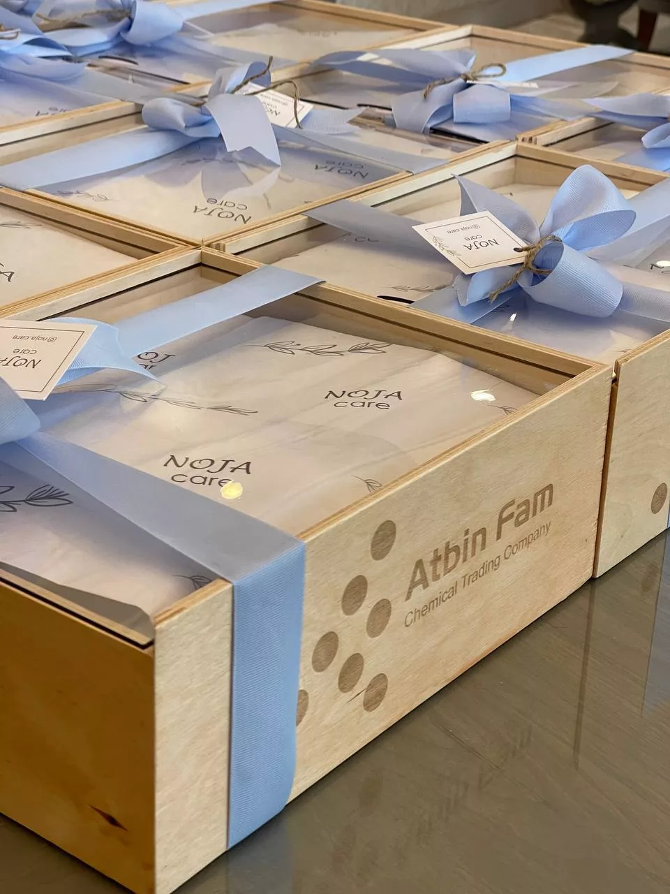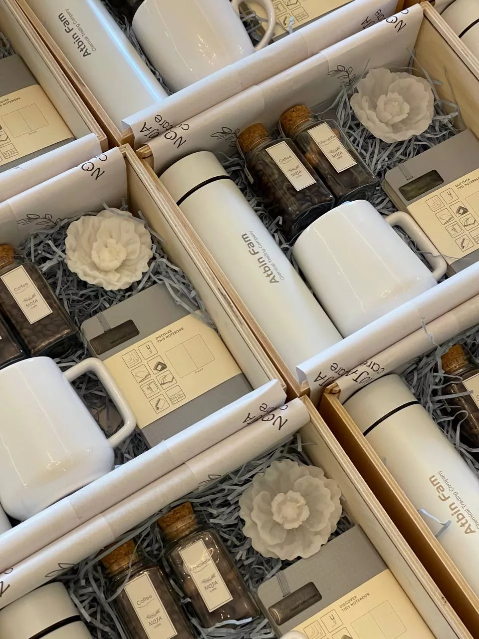 باکس هدیه چوبی شرکتی شامل :فلاسک،دانه قهوه،شکلات دراژه،دفتر یوروپن به همراه حک لوگو