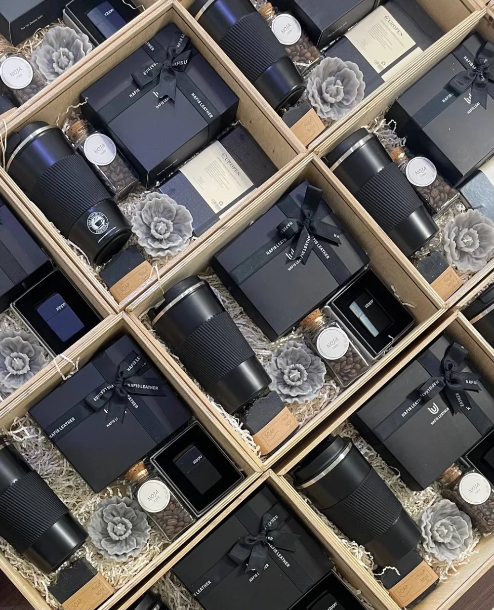 باکس هدیه چوبی شرکتی شامل : تراول ماگ،جا کارتی چرم طبیعی،صابون دست ساز،شمع،فندک،دانه قهوه ودفتر یوروپن