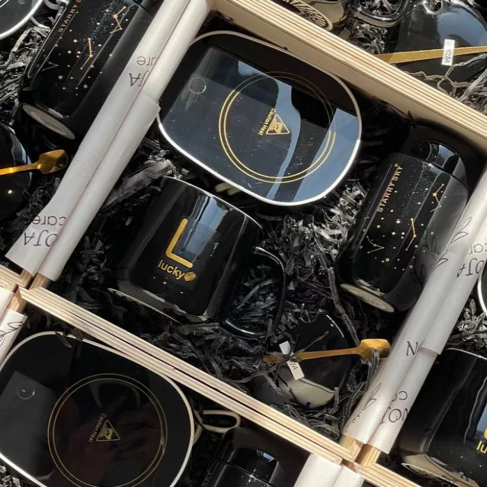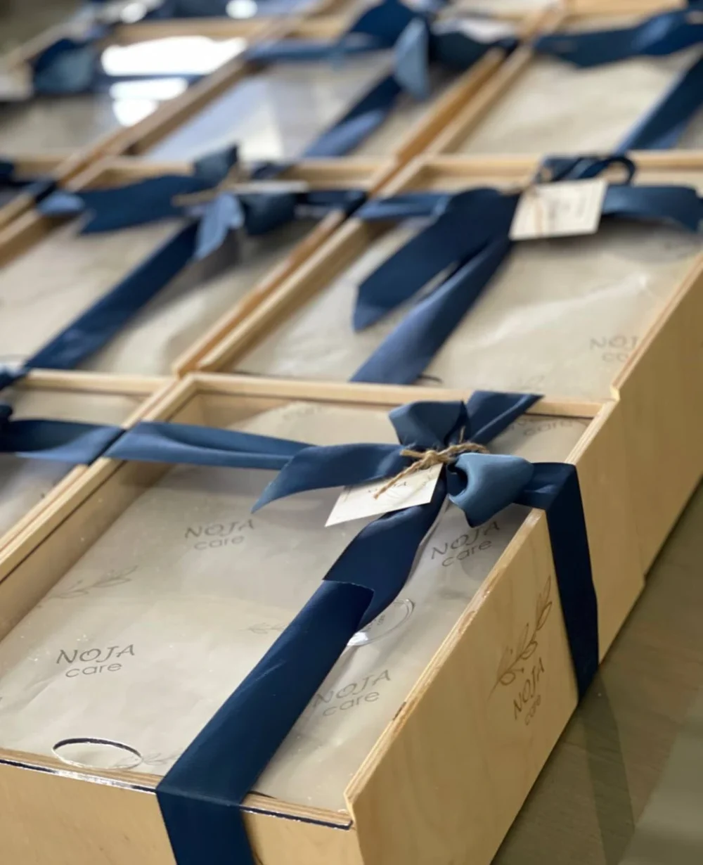 باکس هدیه چوبی شرکتی شامل : فرنج پرس،شکلات بار،دمنوش،دفتر یوروپن به همراه پوشال و روبان