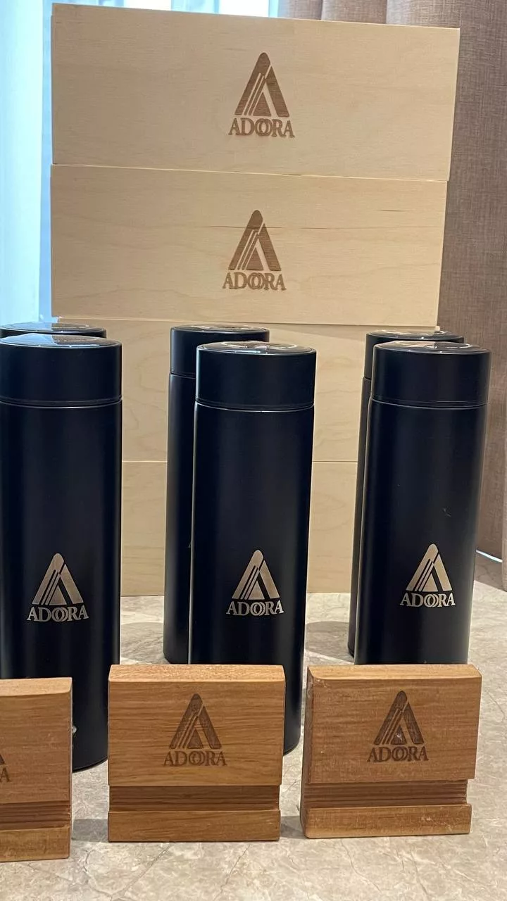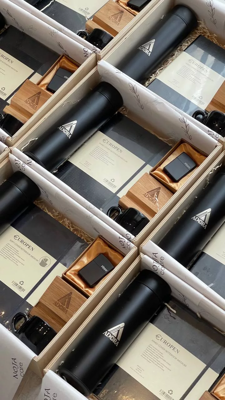 باکس چوبی شرکتی شامل فلاسک،استند موبایل،فندک،دفترچه یوروپن،فنجون به همراه پوشال و روبان