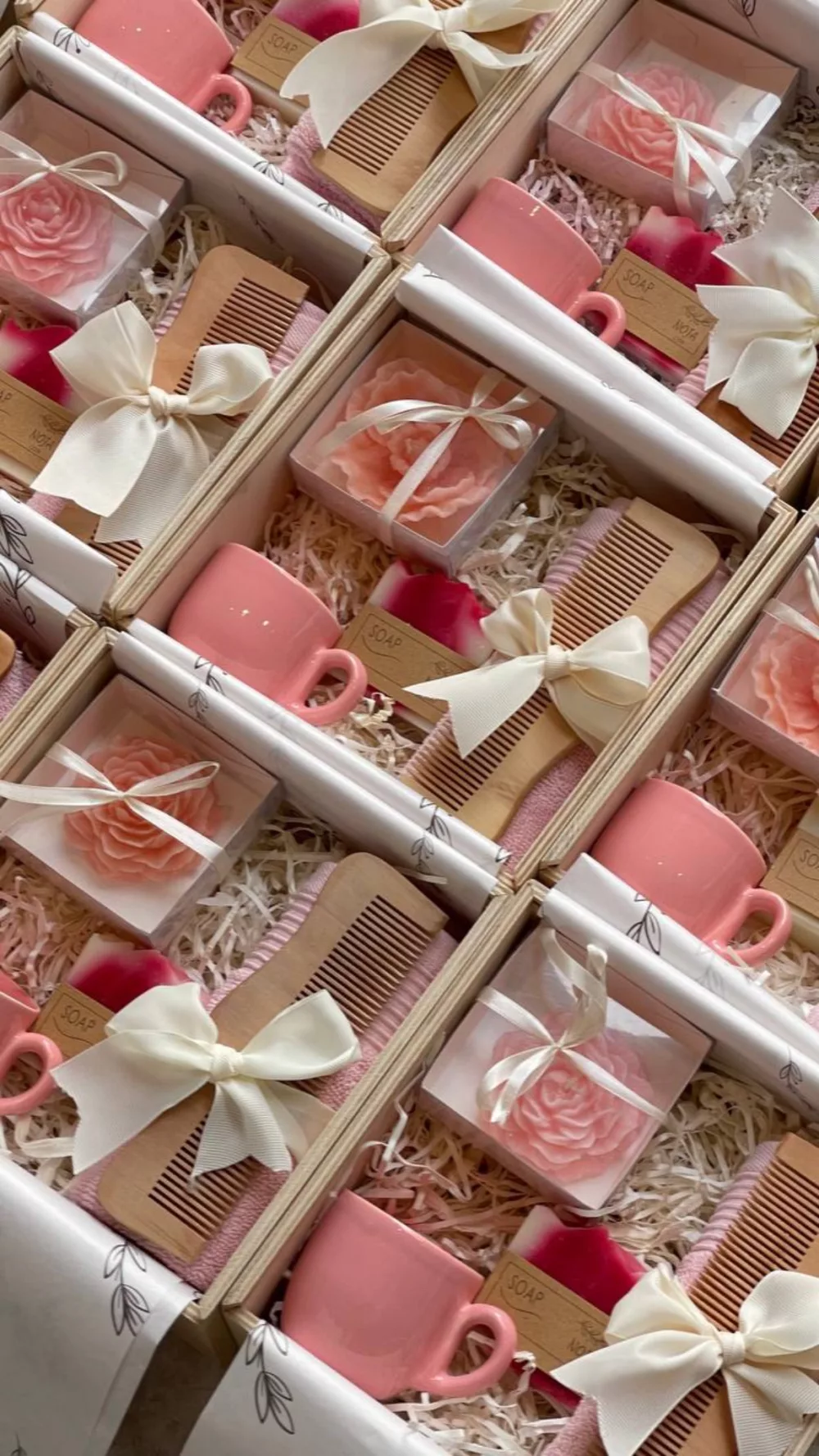 باکس چوبی شرکتی شامل : فنجون،صابون دستساز،حوله دست و صورت،شانه چوبی،شمع به همراه پوشال و روبان